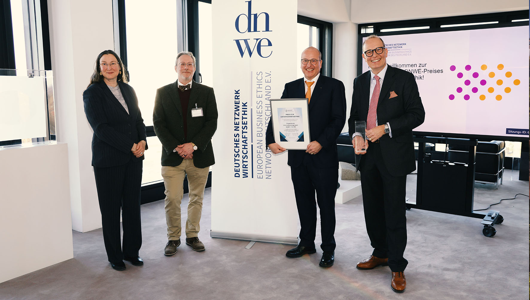 Die Jurymitglieder Prof. Dr. Monika Eigenstetter und Prof. Dr. Michael Aßländer übergeben den DNWE-Preis für Unternehmensethik an Olaf und Arnulf Piepenbrock, geschäftsführende Gesellschafter der gleichnamigen Unternehmensgruppe.